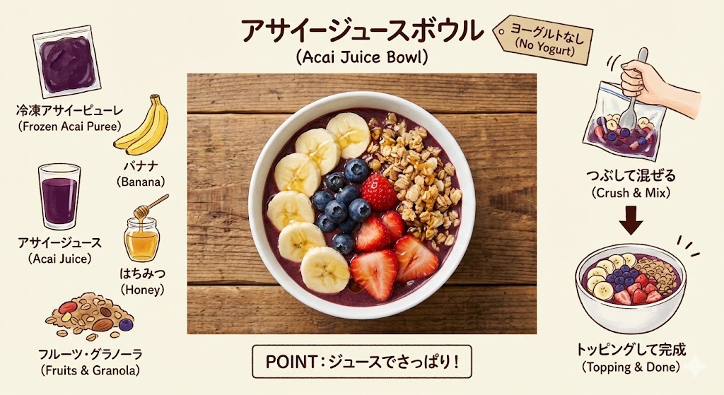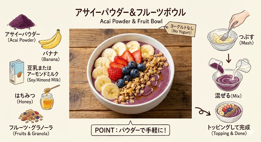 アサイーボウルは彩りが美しく、ヨーグルトを使うのが定番ですが、実はヨーグルトなしでも手軽に美味しく作れます。