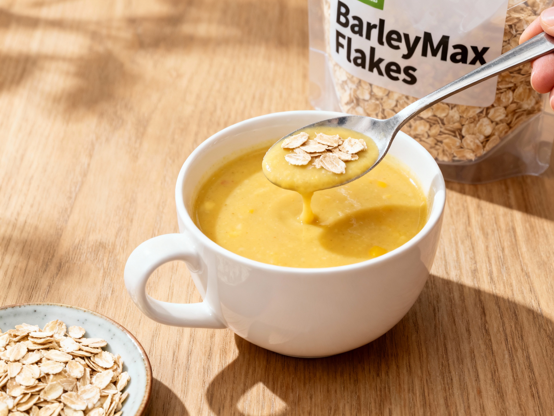 バーリーマックスフレークをさっとひとさじ程度加えるだけで、腹持ちの良いヘルシースープが出来上がります。