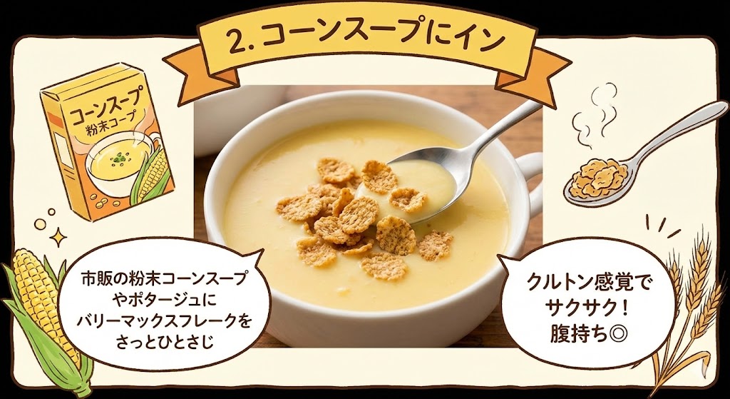市販の粉末コーンスープやポタージュにお湯を注いで、そこにバーリーマックスフレークを「追いトッピング」するだけ。