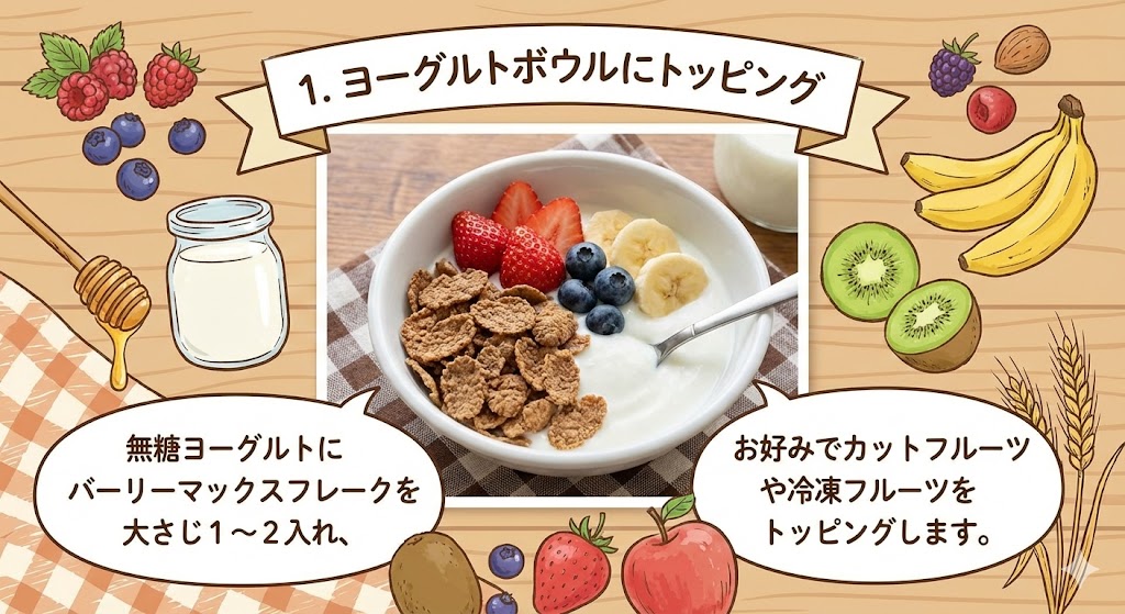 バーリーマックスフレークは、毎日同じ食べ方だと飽きてしまうこともありますが、実はとても手軽にアレンジできて、いろいろな楽しみ方ができる食材です。