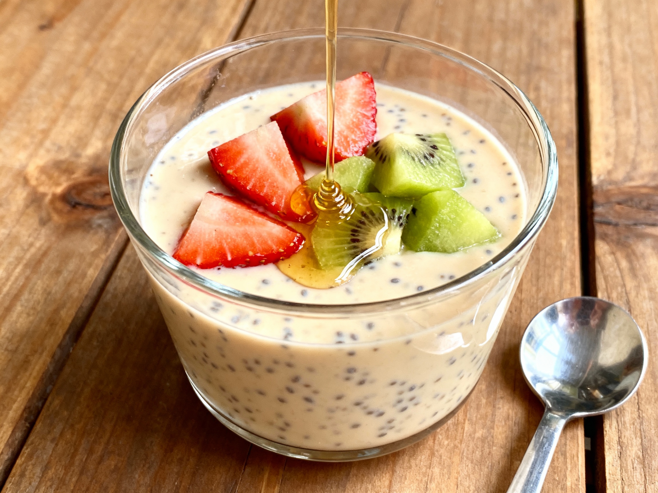 1. ヨーグルトにチアシードとバニラエッセンスを加え、よく混ぜて冷蔵庫で一晩寝かせます。
