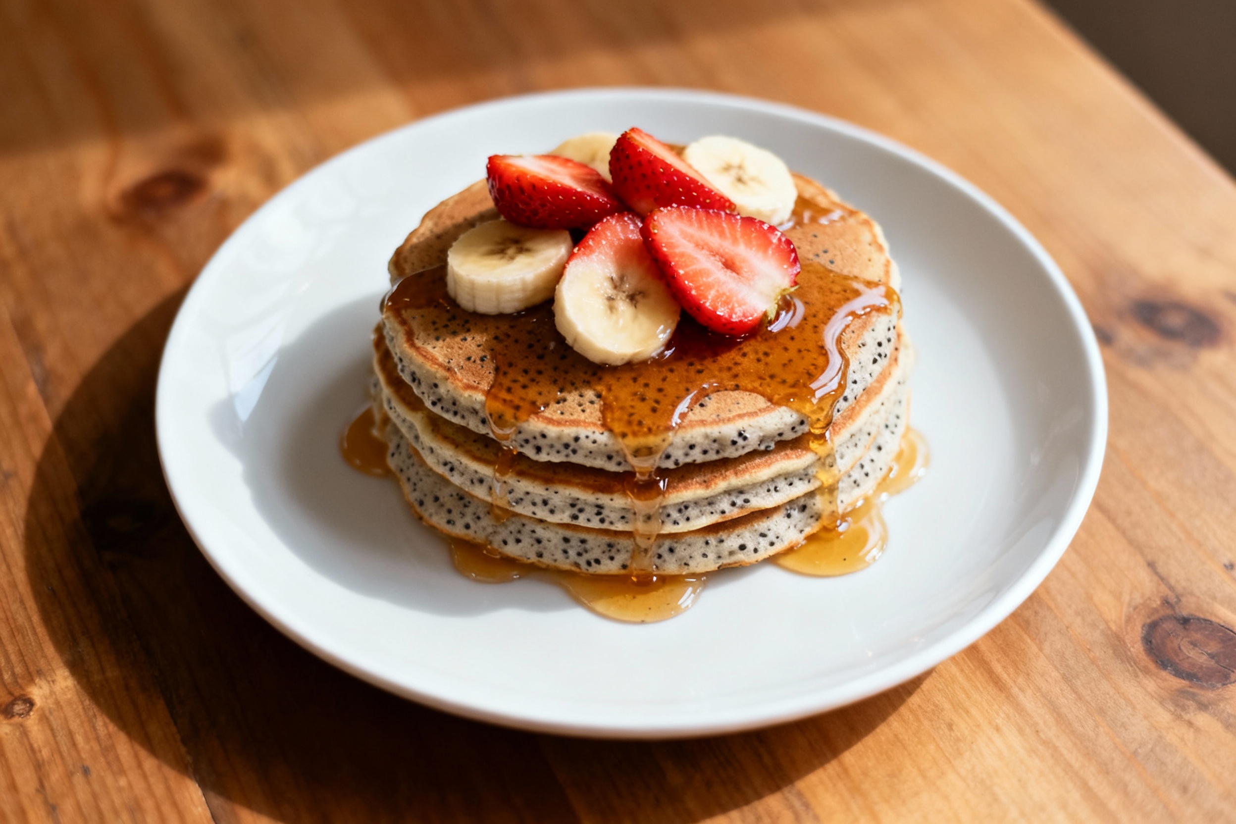パンケーキはふやかしたチアシードを加えて焼くと、ふっくら&プチプチ食感がアクセントになります。