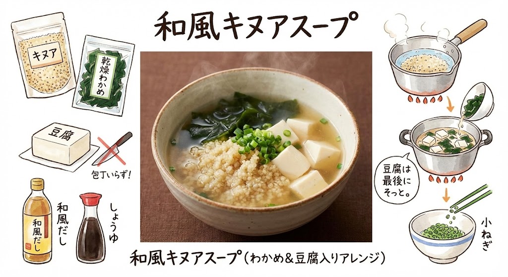 ③ 和風キヌアスープ(わかめ&豆腐入りアレンジ)